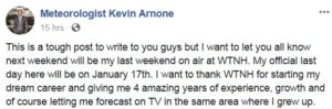 Uncategorized Arnone Leaving By Dean Pagani - January 8, 2018 0 2507 Share on Facebook Tweet on Twitter Kevin Arnone is leaving News 8. The meteorologist posted on social media this weekend that his last day will be January 17th. He has been with the station for four years. From Facebook: