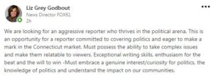 News director Liz Godbout has posted on social media as the station begins a search for a reporter looking to “make a mark” in Connecticut. The posting comes a few days after The Laurel broke the news on the departure of Fox 61 political reporter Jeevan Vittal.