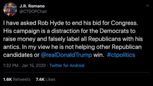 Also yesterday, Connecticut GOP Chairman J.R. Romano called for Hyde to end his run for congress.