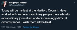 The Hartford Courant’s Greg Hladky announced Thursday morning that today is his last day there. Hladky covered environment, agriculture and food-related issues and politics.