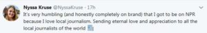 The student at Indiana University used the event to defend local news reporting and explain the role journalists play in communities across the country. Her social media defense was picked up by National Public Radio.