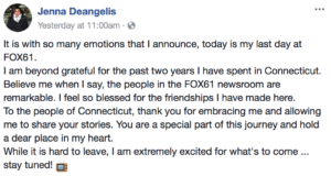 Uncategorized Jenna Moving By Dean Pagani - March 5, 2018 0 2394 Share on Facebook Tweet on Twitter Fox 61’s Jenna Deangelis is moving on, but not saying where yet. She made her announcement on Facebook at the end of last week:
