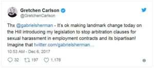 Some might also argue the Carlson case kicked off the last year of progress on the issue of sexual harassment in the workplace. Carlson seems fine with it. She was on Capitol Hill Wednesday to help call attention to a proposal to end mandatory arbitration in harassment cases.