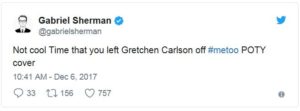 Time magazine is facing some criticism for leaving Gretchen Carlson of Greenwich out of their Person of the Year cover and the accompanying story. Carlson is the former Fox News anchor whose lawsuit against Roger Ailes toppled him as the head of the network and eventually led to the firing of Bill O’Reilly(WFSB).