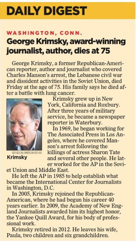 George Krimsky, a former reporter for the Waterbury Republican-American died last week at the age of 75.